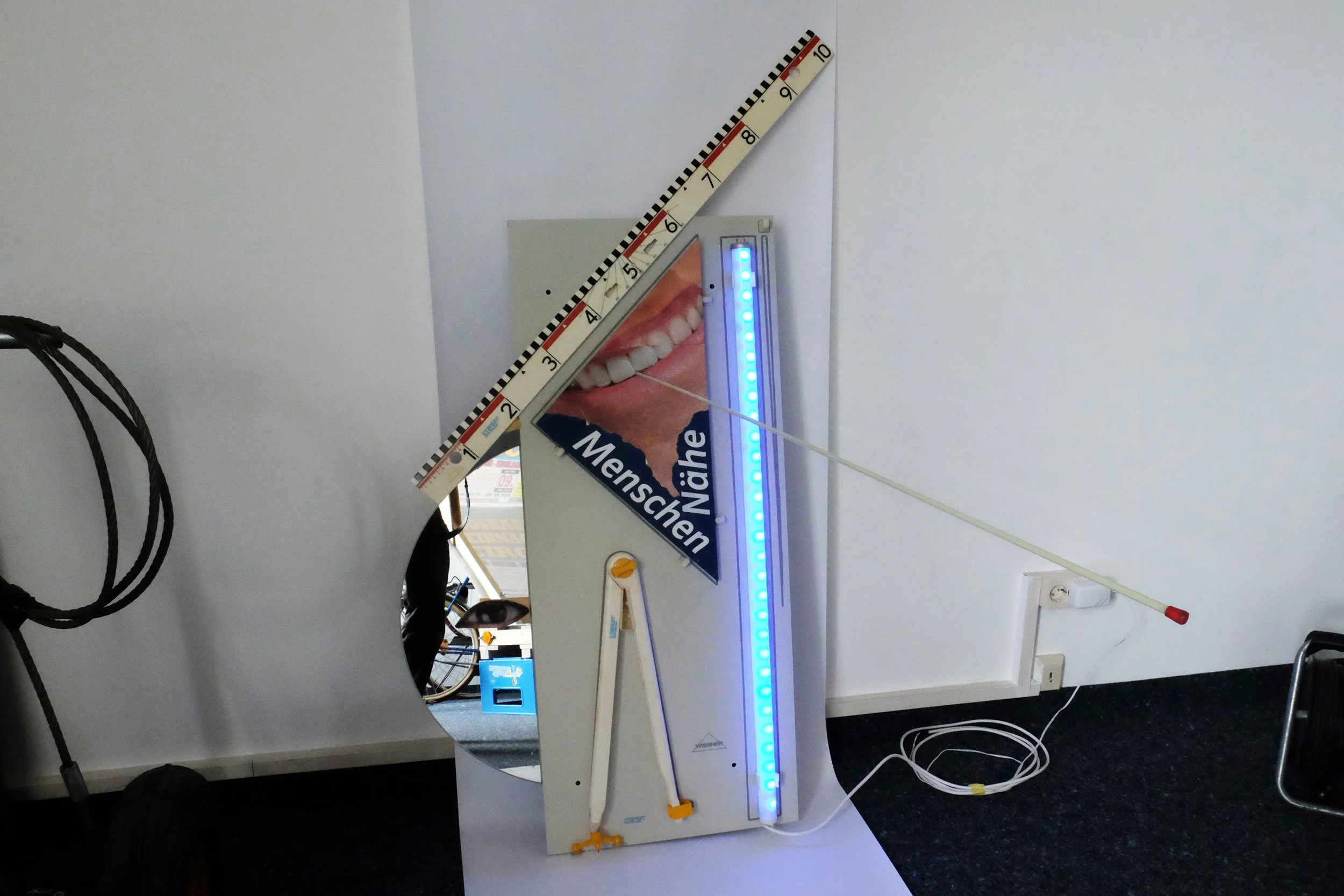 Tim MaxeinerMenschennähe erklärt, 2022 / Human proximity explained, 2022Installation view of Light Objects by Tim Maxeiner at Blaues Haus, AugsburgSchool blackboard tools, mirror, light fixture, campaign ad (CDU Germany)30x45x37 inches Tim MaxeinerMenschennähe erklärt, 2022 / Human proximity explained, 2022School blackboard tools, mirror, light fixture, campaign ad (CDU Germany)30x45x37 inches
